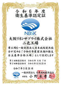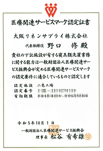 衛生的で快適な看護環境づくりを支援するため、医療関連サービスマーク制度により法令で定められた「衛生基準」を遵守し業務をおこなっている企業として認定を受けており、衛生面で安心してご利用いただけます。